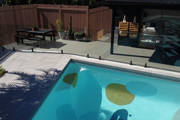 A vertical wooden fence guides visitors into the stunning backyard area, while glass railings fade into the background to provide a seamless view of the pool beyond.